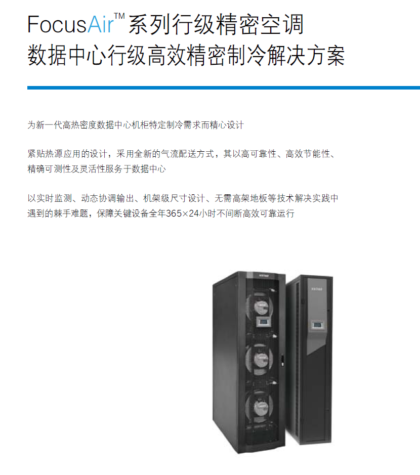 FocusAir系列行级精密空调是为新一代高热密度数据中心机柜特定制冷需求而推出的解决方案。通过紧贴热源的设计,直接处理服务器排出的热风,缩短气流路径,防止冷热风交汇、气流损失降到最低,消除气流及制冷的不确定性。通过对热源负荷变化的实时监测,并精确调节制冷输出量及风机输出量,使制冷量和送风量精确且可预测,实现更有针对性的精确制冷,完美解决数据中心高密度散热问题,保障关键设备全年365×24小时不间断高效可靠运行。